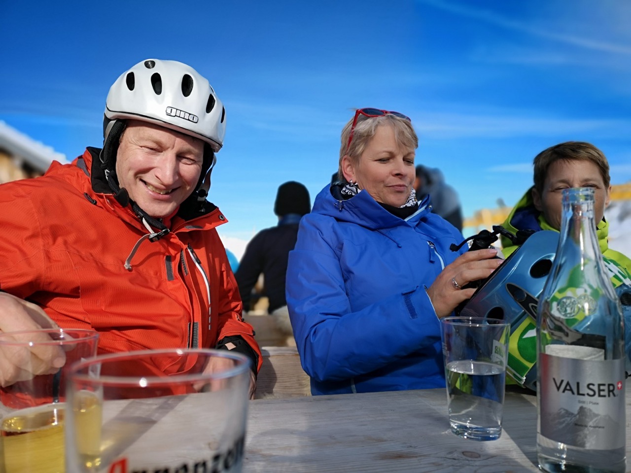 Wir überspringen die nächsten knapp 2.5h und finden uns wieder im Hotel Seebenalp in den Flumserbergen. Die Gepäckstücke wurden verstaut und die Anwesenden schnallten sich in voller Skimontur ihre Bretter unter die Füsse. Piste, wir kommen! Nach einigen fetzigen Abfahrten trafen wir uns im Restaurant Maschgenlücke zum Mittagessen, wo bereits die ersten Anekdoten ausgetauscht wurden. Interessant, was innerhalb von knapp 3h so alles passieren kann. Nach einem leckeren à-la-carte-Menu ging es dann wieder zurück auf die mittlerweile etwas aufgetaute Piste. In den unteren Abfahrtshängen war es teilweise beinahe sinnvoll, die mitgebrachten Bretter durch Wasserskier zu ersetzen.
