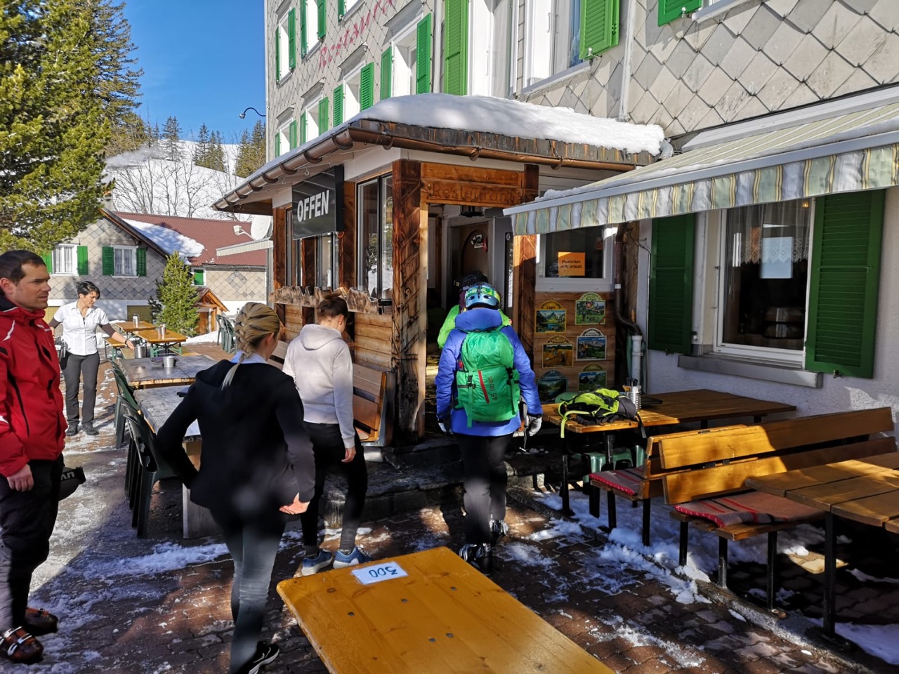 Nachdem die Schar in kleineren Gruppen die Hänge erneut unsicher gemacht hatte, die Beizen über den Mittag unsere Mitglieder verköstigt hatten und das Wetter (dritter Verweis) noch immer mit strahlend blauem Himmel und frühlingshaften Temperaturen von sich überzeugte, traf sich die schar schliesslich gegen 15 Uhr wieder im Hotel Seebenalp, wo das Gepäck bereits auf uns wartete.